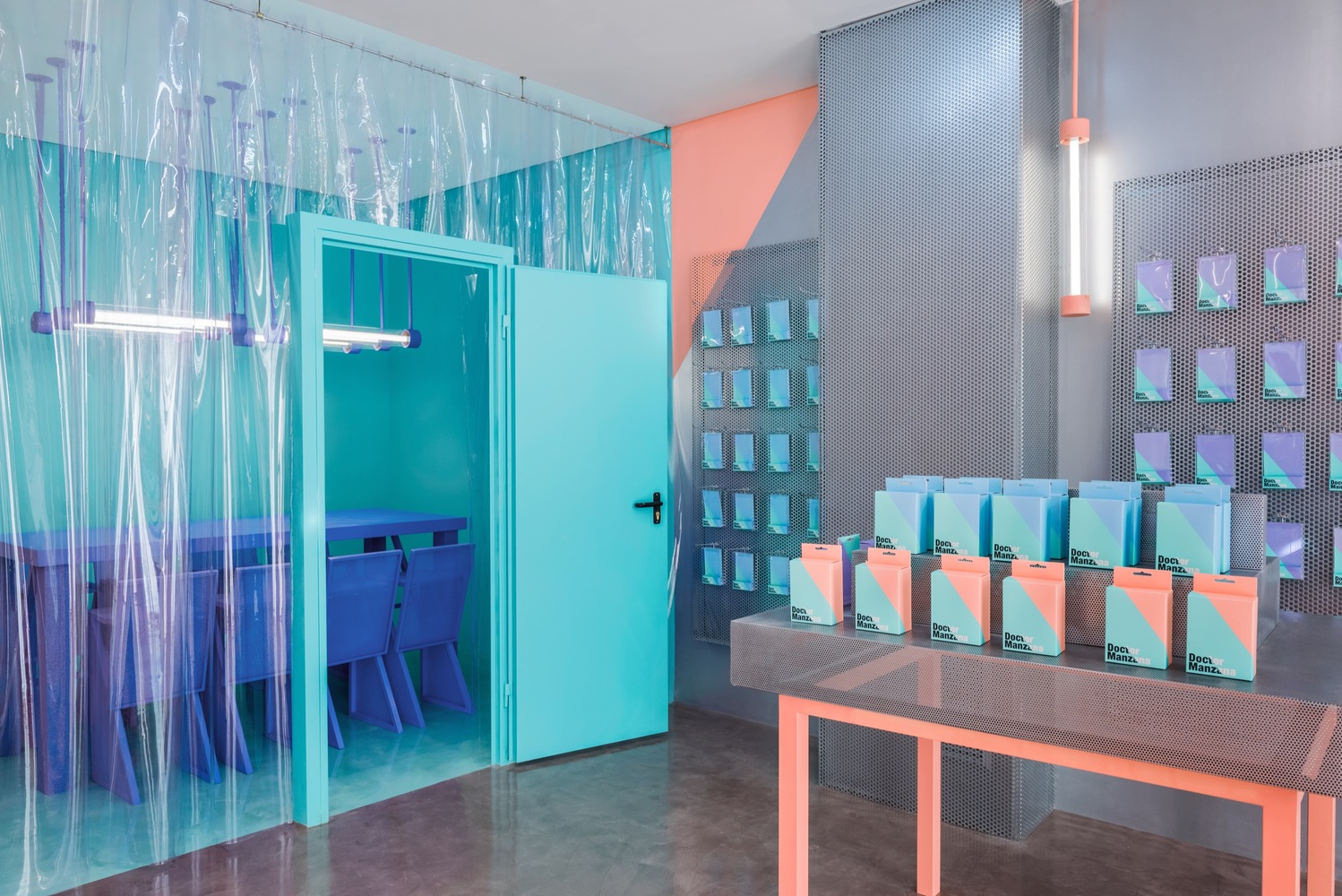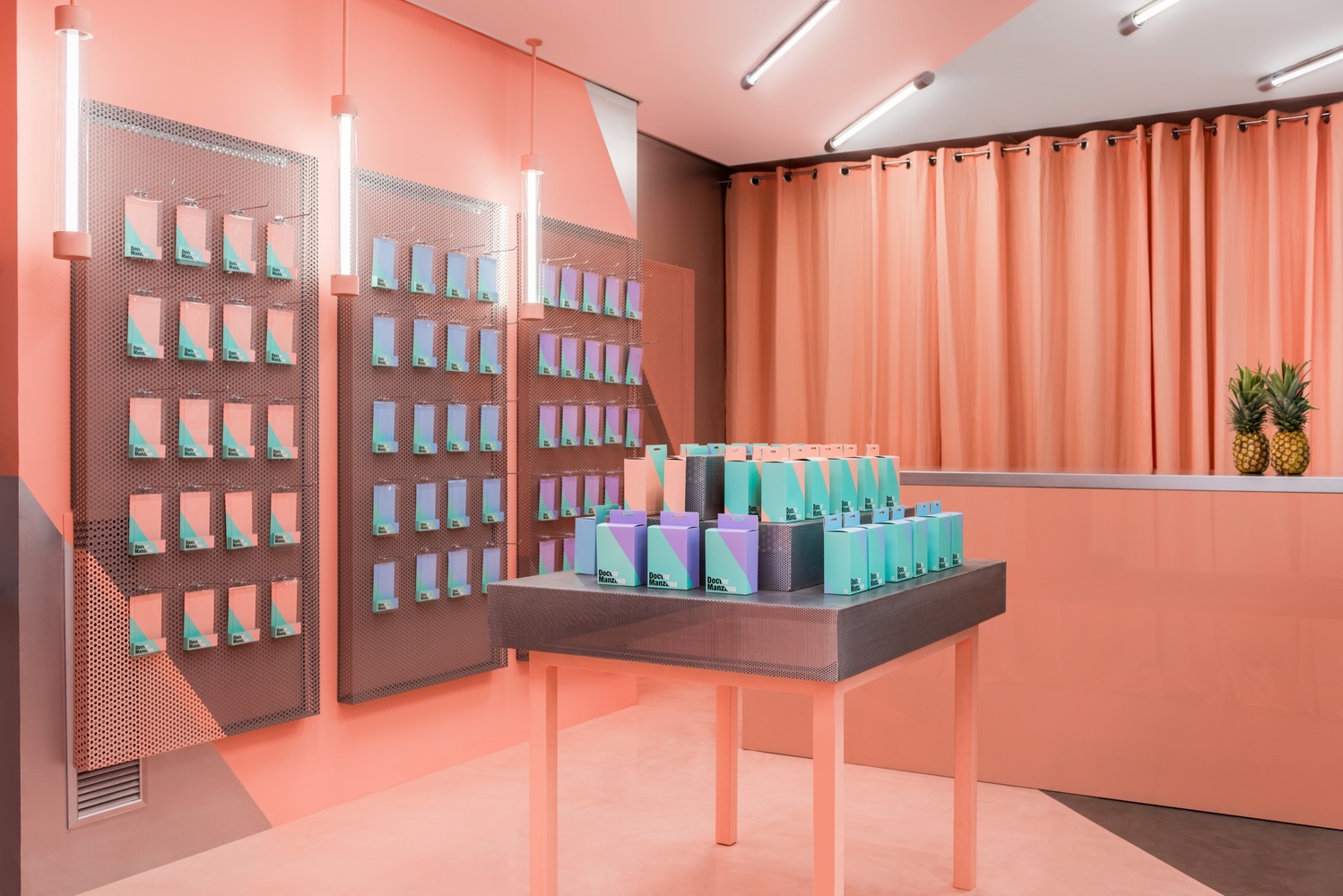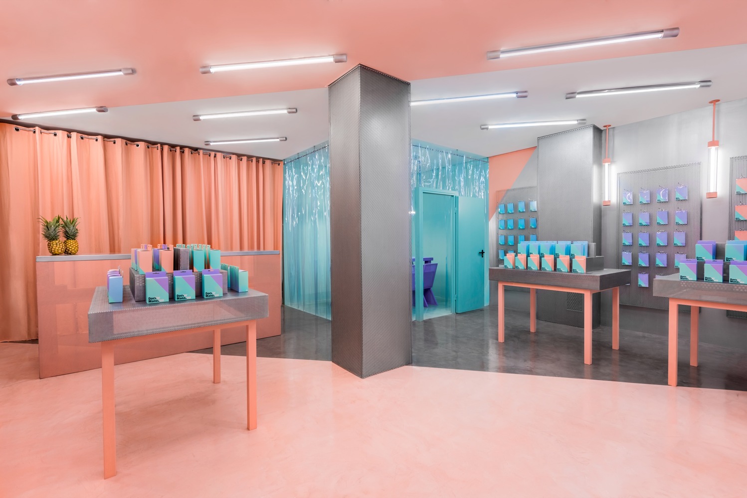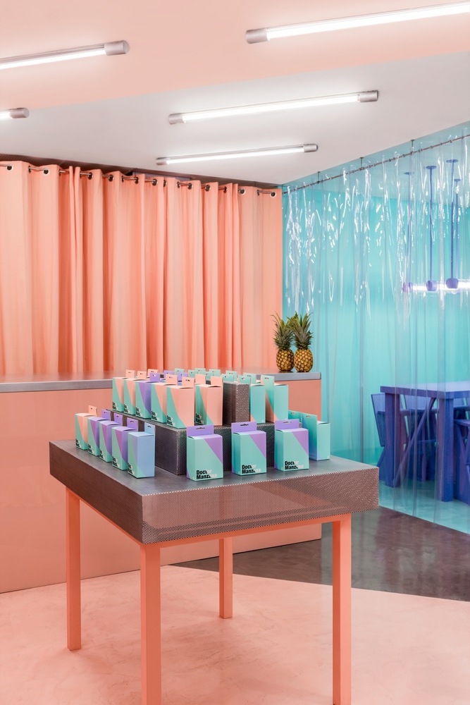 Esta é uma loja de gadgets e reparos de smartphones que você nunca irá esquecer. Isso porque os arquitetos criaram toda a identidade visual da empresa, da marca até o espaço, projetando as mesmas cores e ângulos no ambiente da loja. Isso significa levar para casa as embalagens e ao ver na rua essas cores e diferentes ângulos, saber que estamos falando de Doctor Manzana. Isso sim é uma presença de marca!