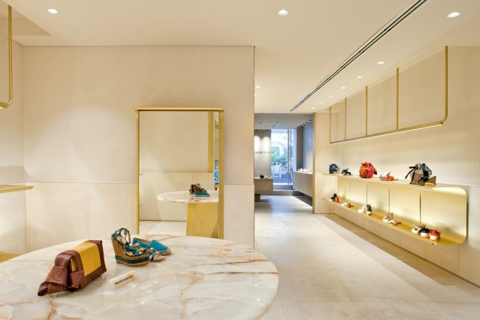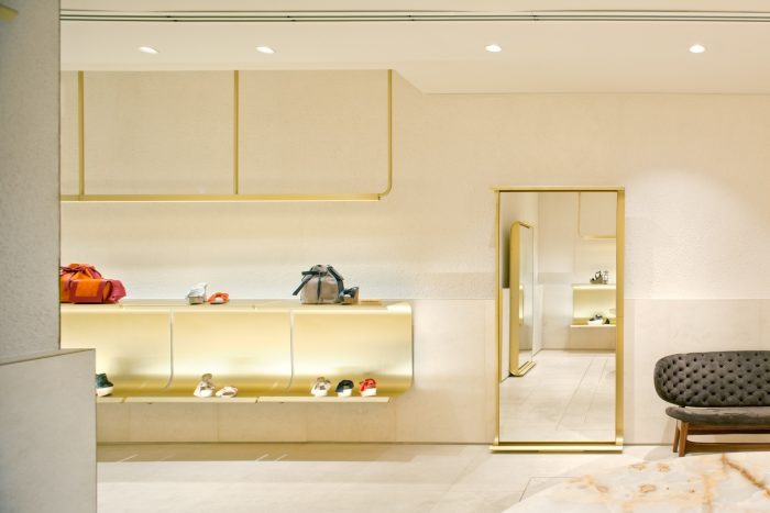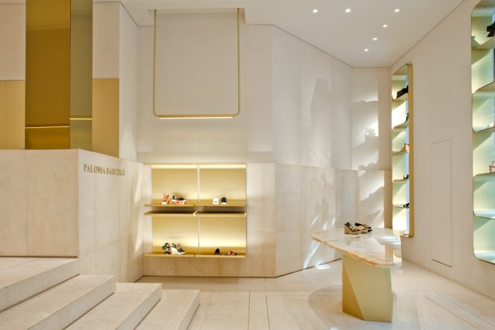 Aqui o ambiente está longe de ser o protagonista. Com o uso de diferentes texturas para o piso, parede e teto, a loja de calçados emoldura os seus produtos com o mínimo de mobiliário e materiais. O uso de cores neutras e materiais singelos evidencia ainda mais os produtos expostos, agregando um valor mais do que sofisticado aos calçados.