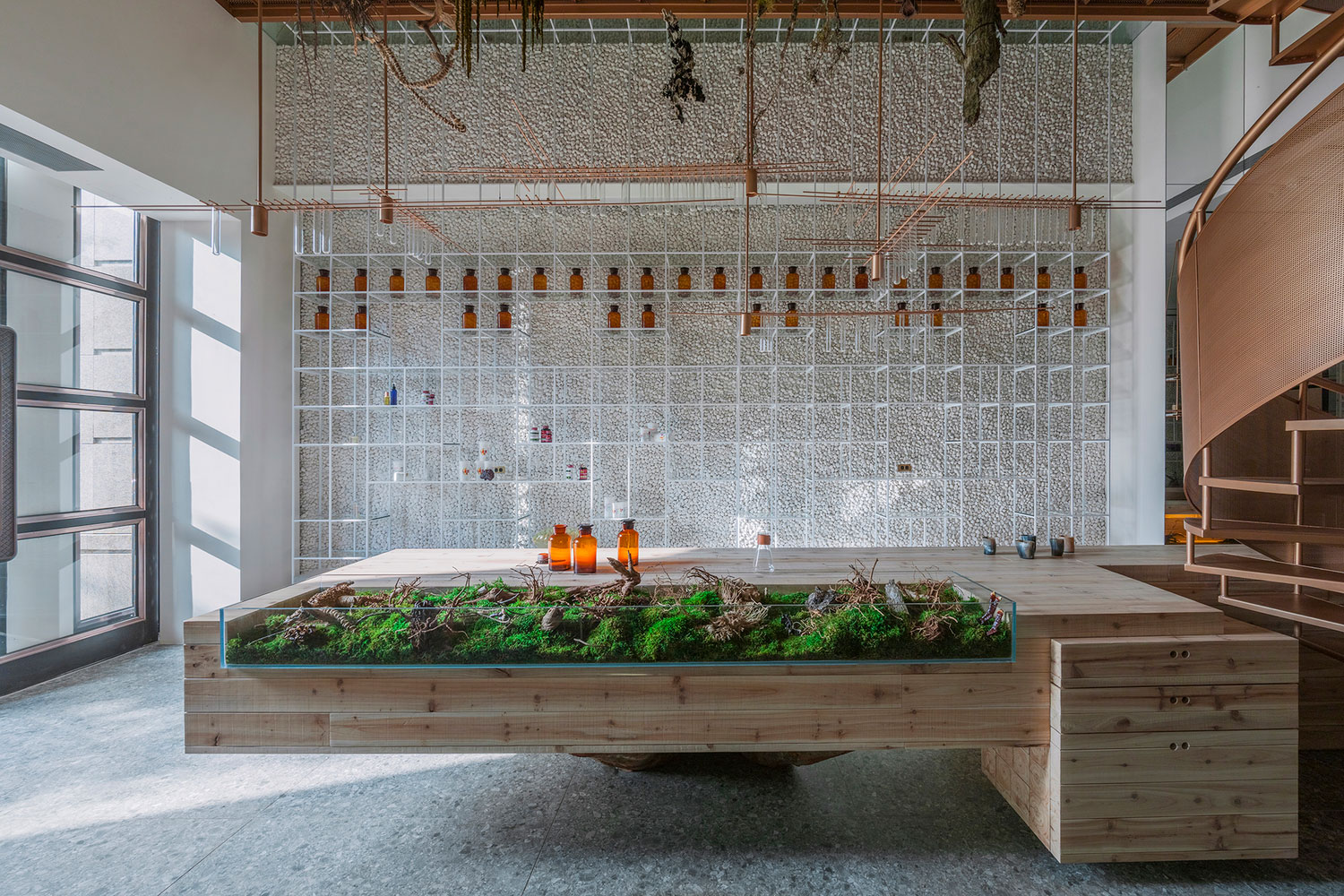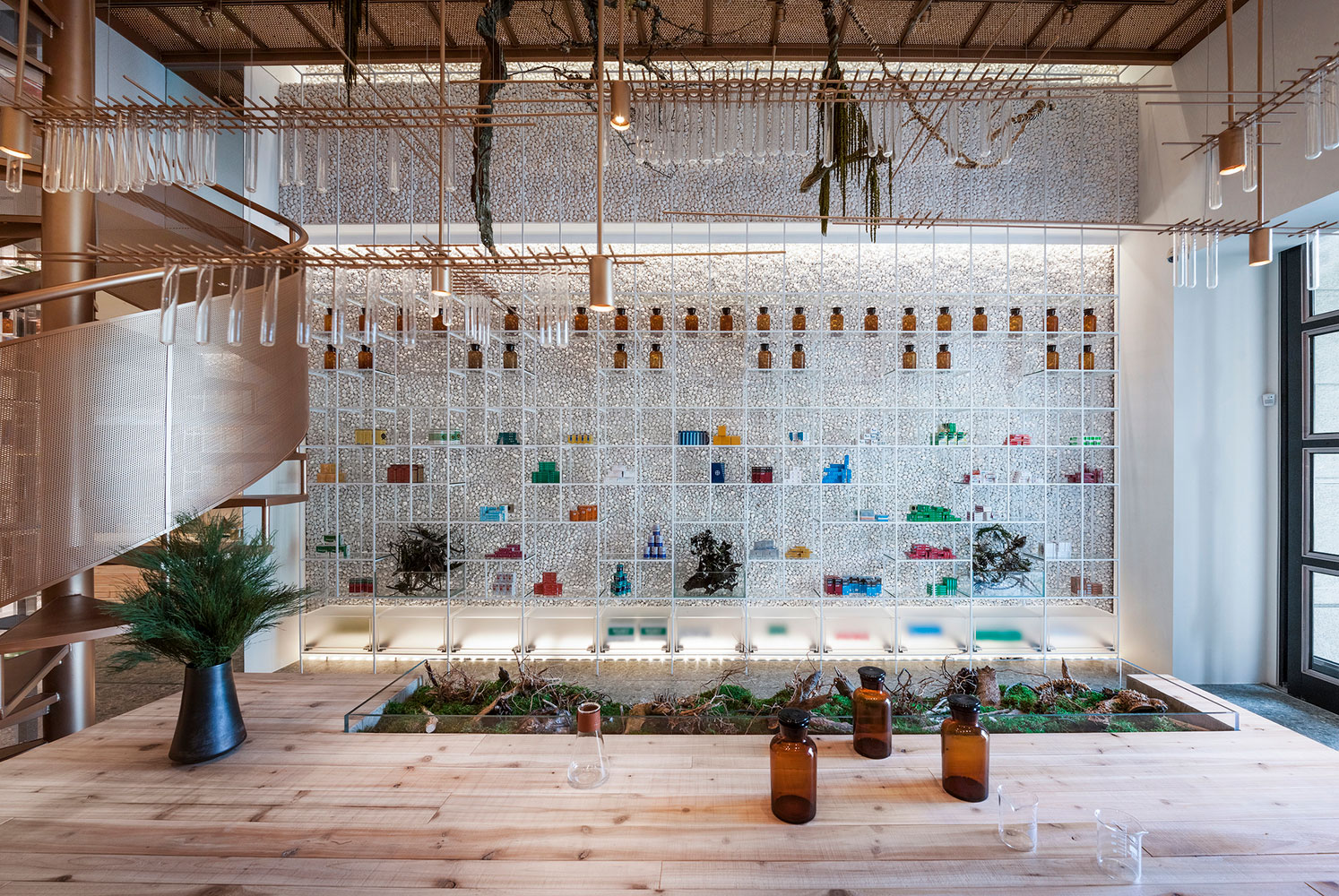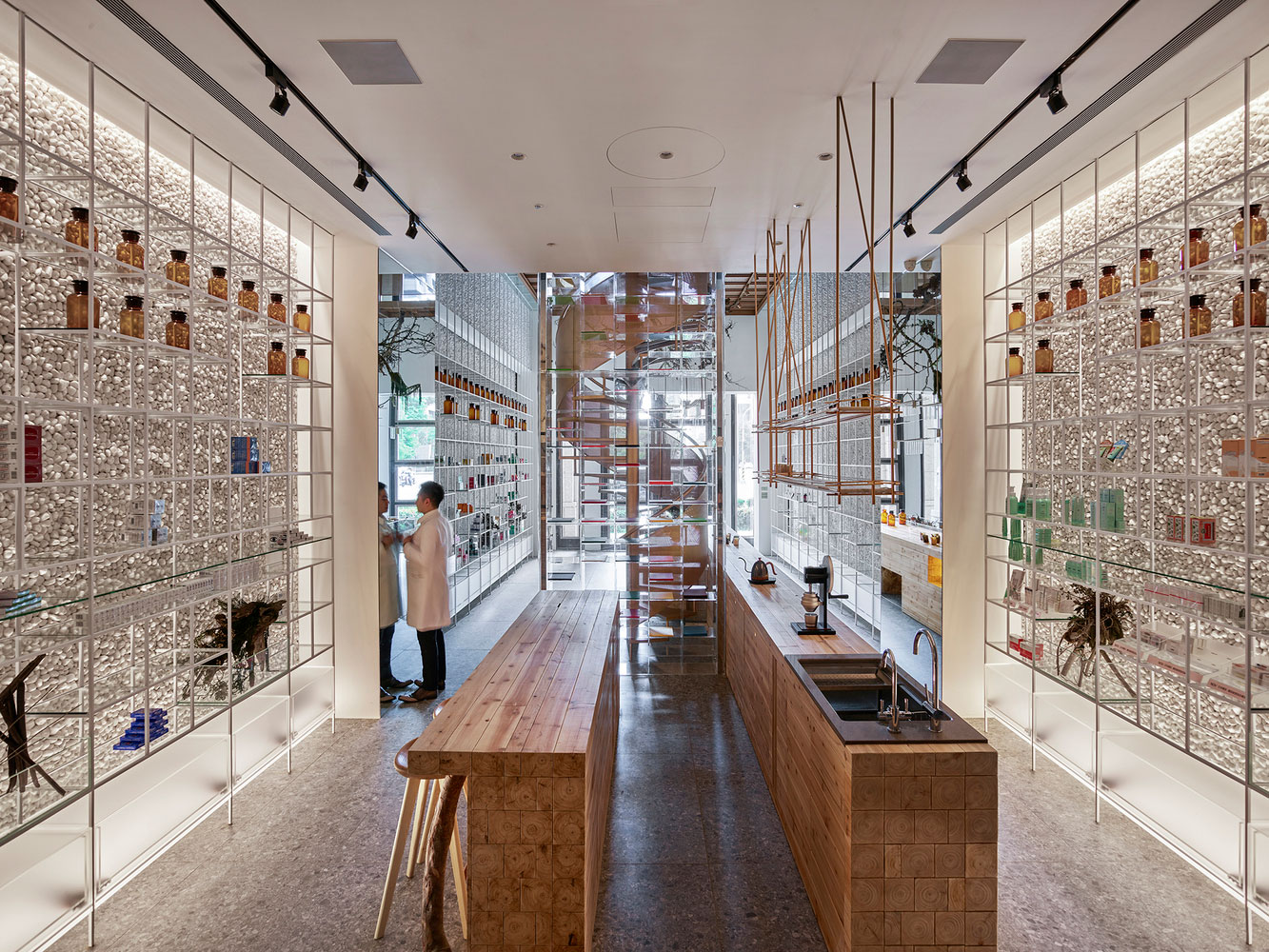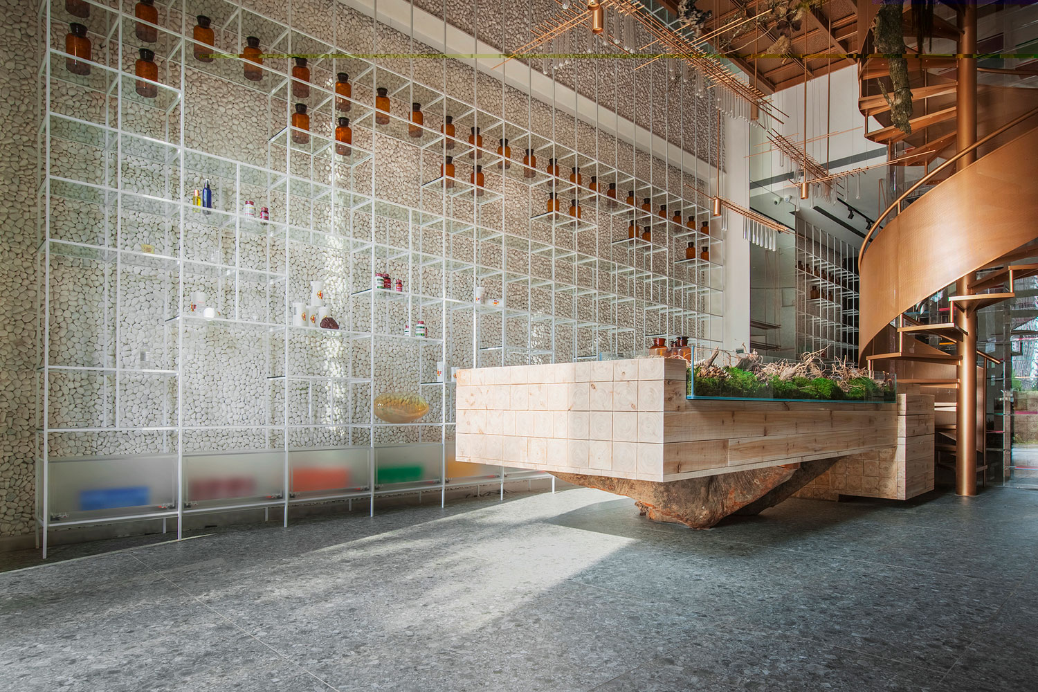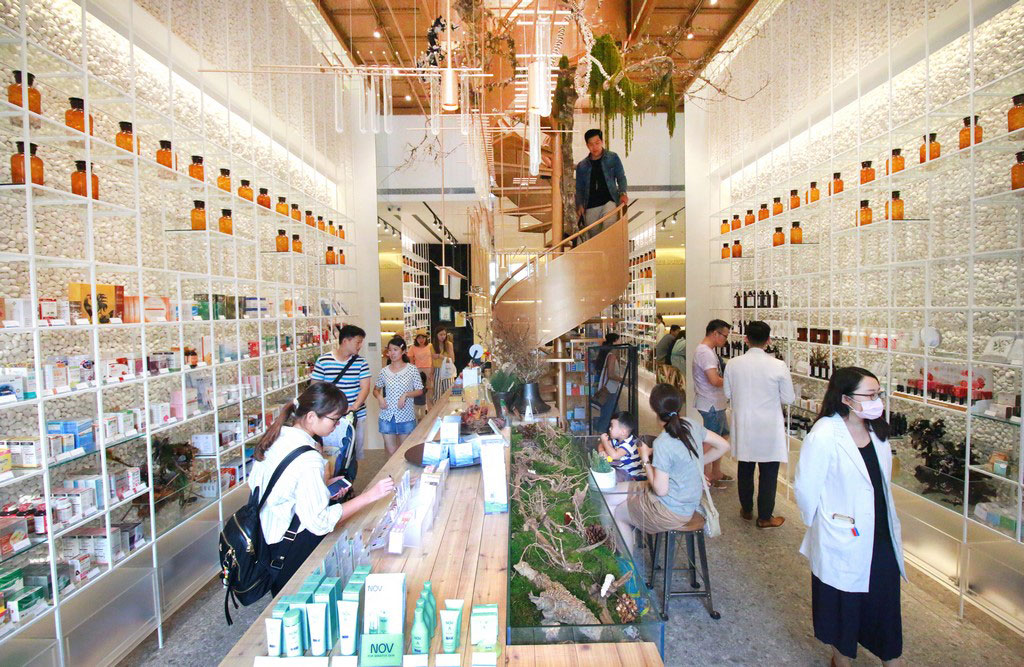 Quem disse que uma farmácia precisa ser toda branca, sem graça e com cara de hospital? O proprietário da terceira geração de farmácias Molecure em Taiwan decidiu mostrar para seus clientes que uma farmácia pode sim representar um momento de cura. Os arquitetos do projeto tentaram então combinar a origem da medicina, com um toque de natureza com a tecnologia de hoje, trazendo elementos da arquitetura como o aço e uma certa racionalidade de projeto.